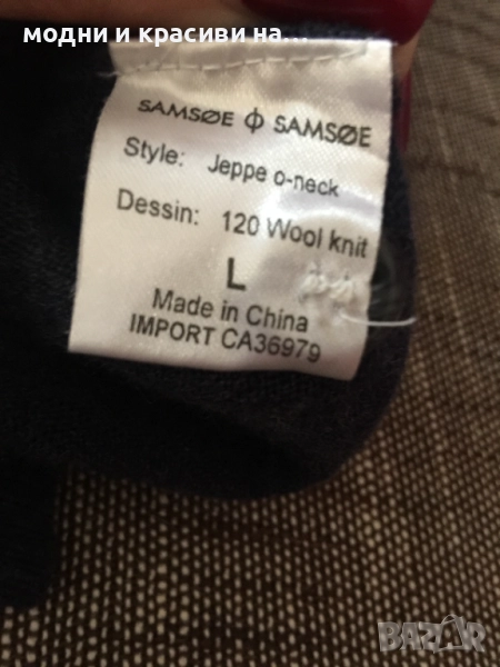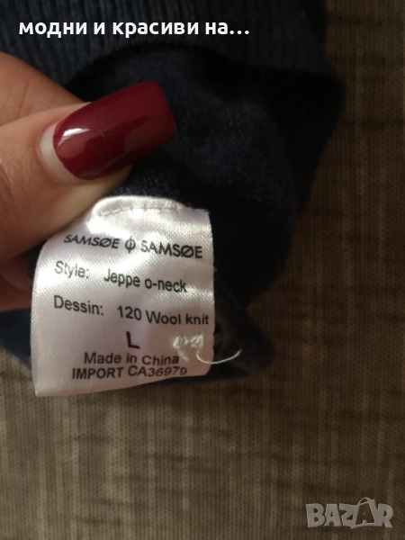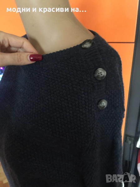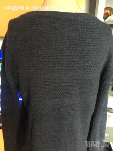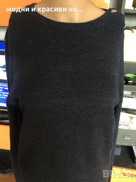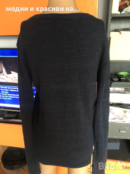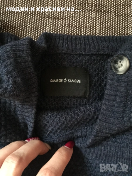 Мъжки пуловер на скандинавския бранд Samsøe Samsøe в тъмносисин цвят. Много интересен акцента са копчетата на едно рамо-нестандартен и ефектен дизайн. Има две плетки, съчетани в пуловера, Едната е в горната част, оформена като релефна с редуване на гладка, а в долната част плетивото е изцяло гладко.