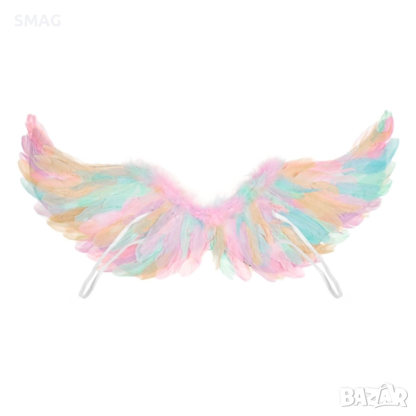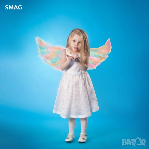 Цветни карнавални крила с дъгови мотиви, подходящи за костюми и Хелоуин визии. Ластиците осигуряват лесно и удобно закрепване. Идеални за празнични събития и маскарад.