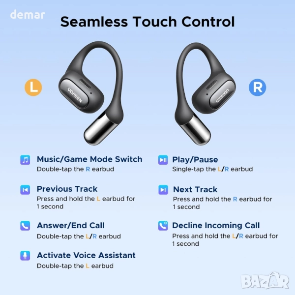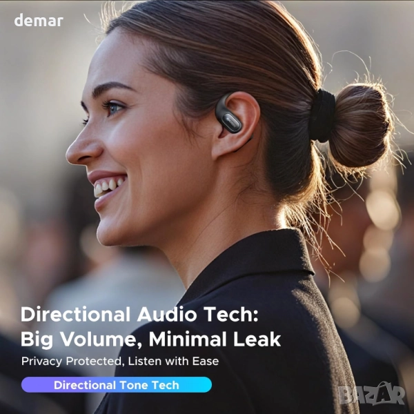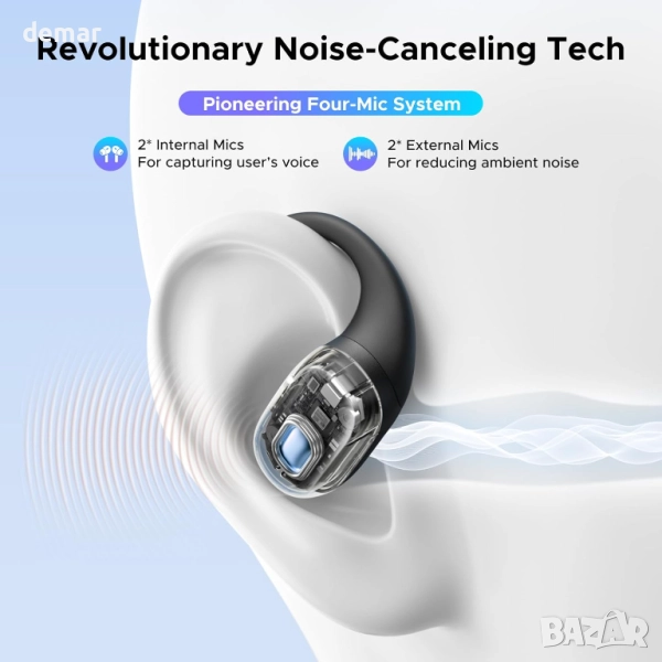 Тези безжични слушалки с отворен уши са с ултралек дизайн от 8,7 грама с гъвкави титаниеви кукички и мек силикон за сигурно и удобно прилягане по време на продължително носене или интензивни тренировки. Те осигуряват завладяващо 3D пространствено звуково изживяване чрез био-диафрагмени високоговорители, предлагайки богат бас и яснота, като същевременно намаляват изтичането на звук. Четири микрофона с AI шумопотискане гарантират ясни разговори дори в шумна среда. С Bluetooth 6.0 те осигуряват стабилна свързаност с ниска латентност и поддържат сдвояване с две устройства. Придружаващото приложение позволява персонализиране на еквалайзера, настройка на сензорното управление и настройки на пространствения звук. Предлагайки до 28 часа време за възпроизвеждане с бързо USB-C зареждане и водоустойчивост IPX5, те са създадени за ежедневна употреба, пътуване и активен начин на живот.