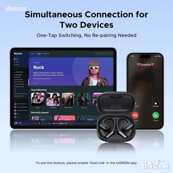 Безжични слушалки UGREEN с отворени уши, Bluetooth 6.0, ясни разговори с 4 микрофона и шумопотискане