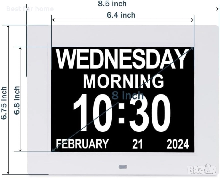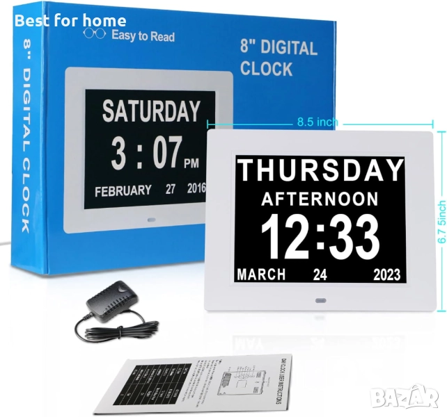 [Най-нова версия] Голям дисплей с дигитален календар и дневен часовник - 12 опции за аларма, дисплей с автоматично затъмняване ниво 5, изключително голям несъкратен ден и месец, идеален за възрастни хора (8 инча).
