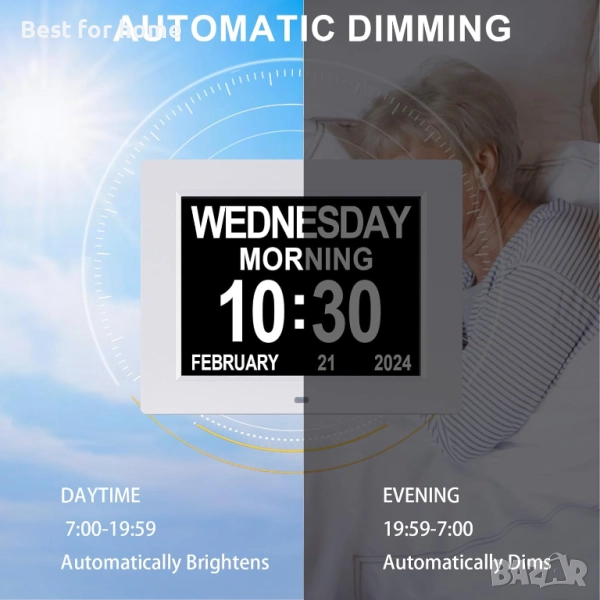 АВТОМАТИЧНО ЗАТЕМЯВАНЕ: Часовниците за деменция автоматично се осветяват между 7:00 и 19:59 ч. и се затъмняват между 19:59 и 19:00 ч. през деня, което ги прави лесни за четене при всякакви условия на осветление, без да нараняват очите. Също така имат възможност за изключване на автоматичната функция, за да регулирате ръчно яркостта според вашите нужди.