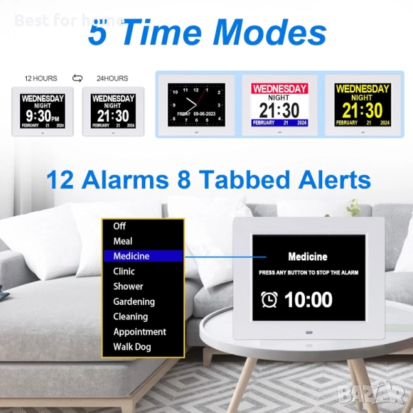 ЛЕСНИ НАСТРОЙКИ НА АЛАРМАТА: часовници за възрастни хора с деменция, изключително големи функции, 12 персонализирани аларми, лесни за настройване, единични аларми, ежедневни, само за делнични дни или само за уикенди. 8 ЕТИКЕТА ЗА НАПОМНЯНИЯ: и добавете етикети за напомняния като срещи, лекарства, ангажименти или разходки с куче. Етикетите за напомняния ще се показват на екрана, а алармите ще се задействат по график. Идеален за ежедневните нужди на възрастните хора и семейството. Бързо се превръща в идеалното устройство за грижа за възрастни хора и домашни грижи.