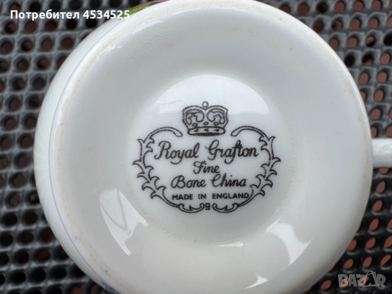 На дъното е поставен оригиналният печат “Royal Grafton Fine Bone China – Made in England”, както и числото 9, което представлява фабричен или декораторски код, потвърждаващ автентичността на изделието.