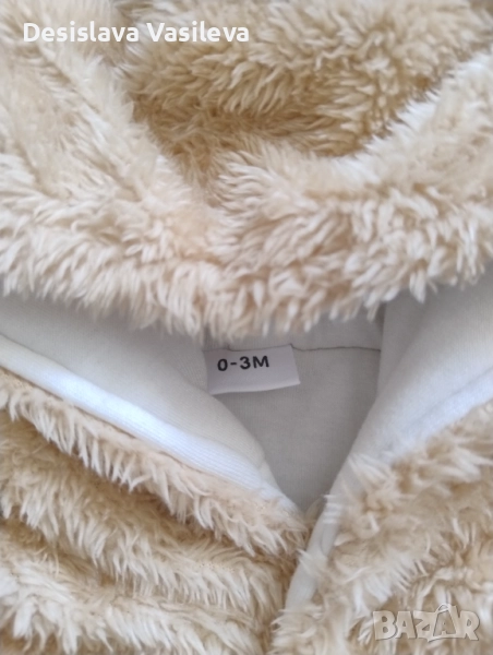 Топъл пухкав гащеризон с ушички. Унисекс, закопчава се с копчета тик-так. Размер 0-3 месеца.