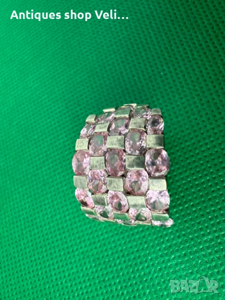 Масивен и красив сребърен пръстен с розови циркони. Добро състояние. Предлагаме доставка с Еконт и лично предаване за градовете Велико Търново, Русе и Сливен. Диаметър-20мм.