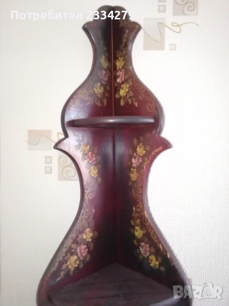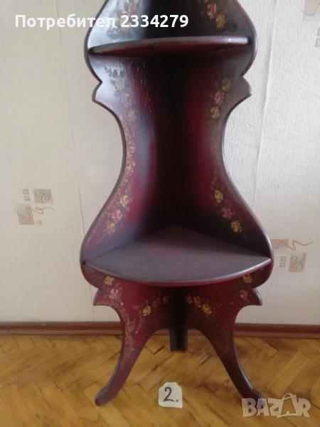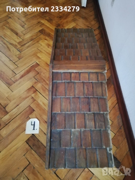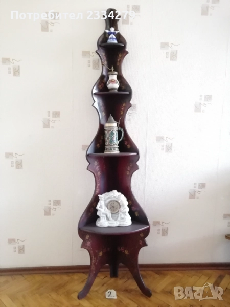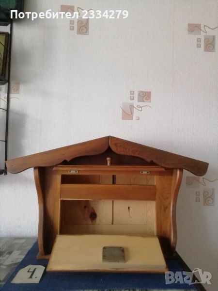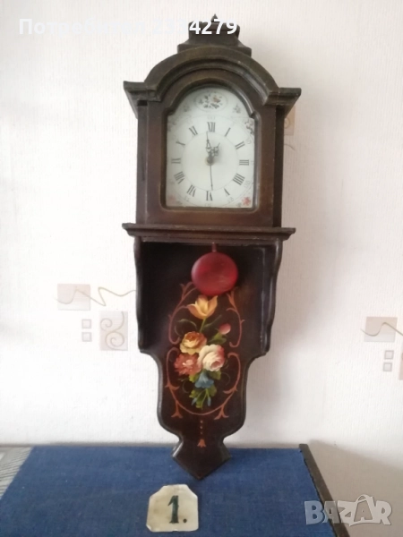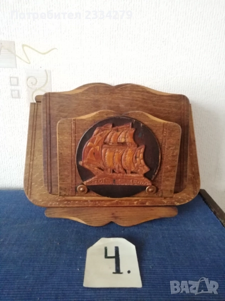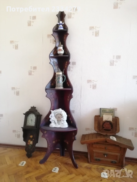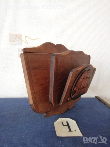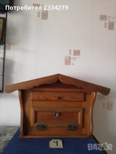 стенен часовник изработен в холандско ателие, ръчно рисуван, електро механика има движещо махало, размери 70х20см., цена 70лв.; N:2 дървена орнаментирана ъглова етажерка, многорафтова стара ръчна изработка от холандски майстор, ръчно рисувана с размери височина 1м.90см., широчина 33см.,цена 90лв.; N:3 корабна поличка-рафт за дневник, вестници и други, дървена авторска ръчна изработка с кораб дърворезба, размери вис. 27см, шир. 30х13см., цена 40лв.; N:4 масивна дървена пощенска кутия, ръчно изработени и монтирани детайли, холандски дърводелец, размери 60х40х19см., цена 90лв.