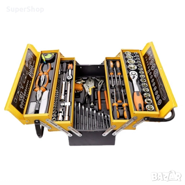 Здрава и функционален Метален Куфар за инструменти на три етажа, който осигурява отлична организация и удобен достъп до съдържанието. Конструкцията ѝ се разгъва странично, което позволява бързо и лесно намиране на необходимия инструмент. Подходяща е за професионална и домашна употреба – в работилници, сервизи, гаражи или за личния майстор.