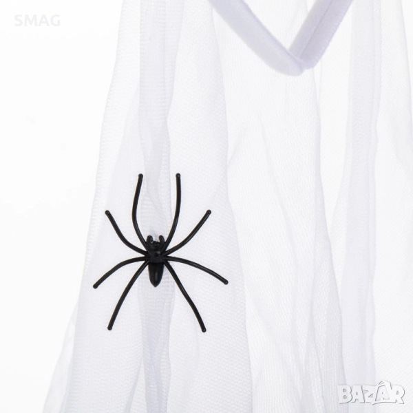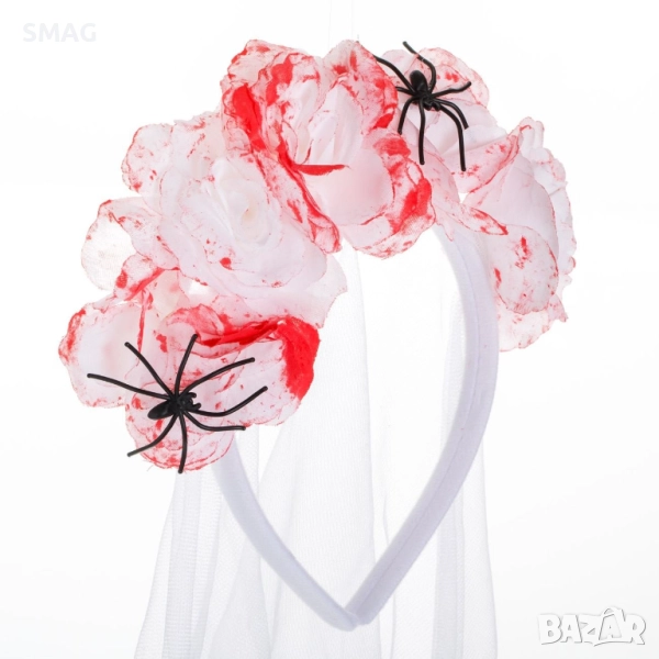 Уникална диадема в стил „кървава булка“, украсена с бели рози, напоени с червена боя, и бял тюл, обсипан с малки паяци. Перфектен аксесоар за страховита и ефектна Хелоуин визия!