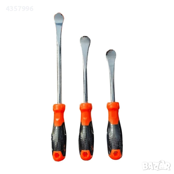 Професионален комплект от 3 лоста за гуми, предназначени за лесен и безопасен монтаж и демонтаж на гуми от джанти. Изработени от закалена стомана с хромирано покритие и оборудвани с ергономични двуцветни дръжки за стабилен и удобен захват.