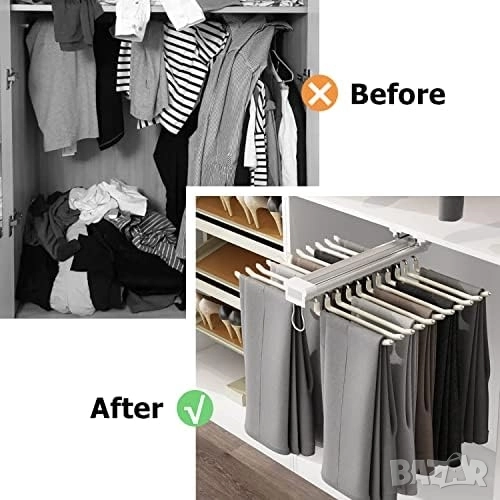 Този органайзер елиминира бъркотията, спестява ценно място в гардероба и удължава живота на вашите дрехи, като ги предпазва от намачкване и деформации. Издърпващият механизъм ви дава бърз и пълен достъп до всичките 22 чифта панталони.