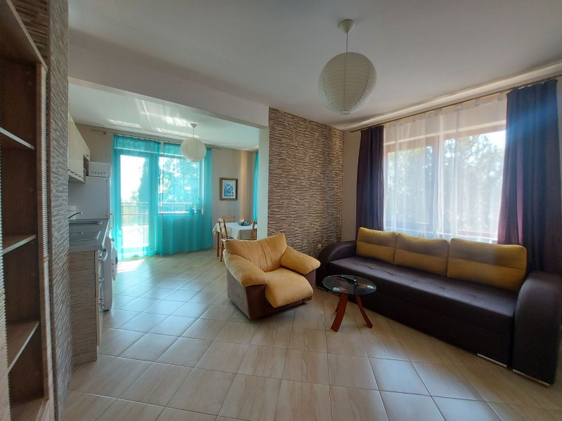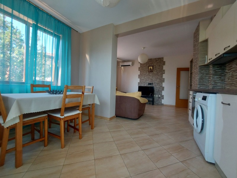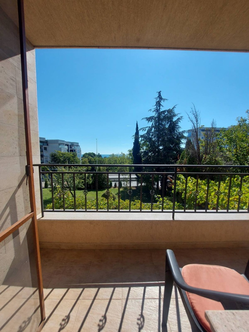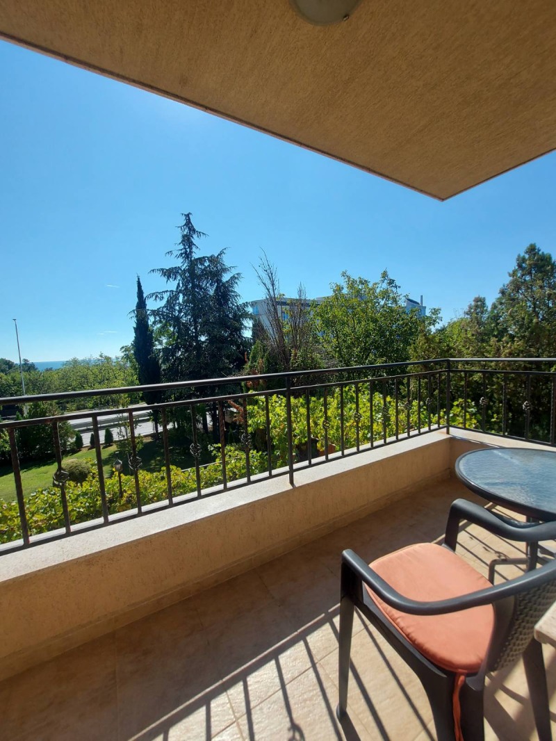 Апартаментът е част от затворен комплекс с голям озеленен двор. Морска панорама. Напълно обзаведен и оборудван с всичко необходимо за живеене. Отоплява се с климатици.