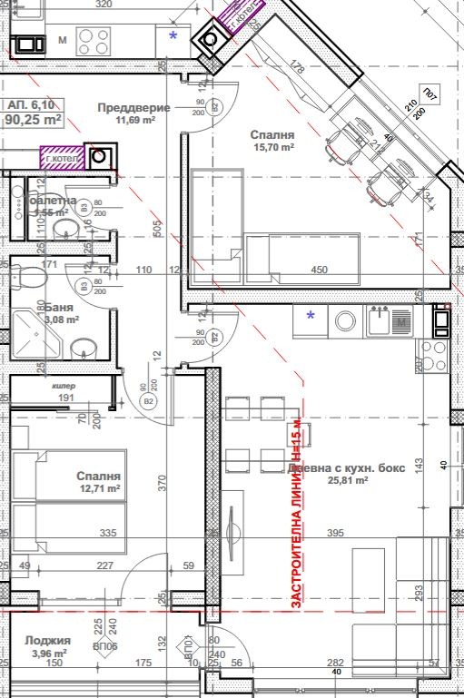 Разпределението на имота включва: входно антре, всекидневна с кухненски бокс, две спални помещения, баня с тоалетна, отделна тоалетна и лоджия.