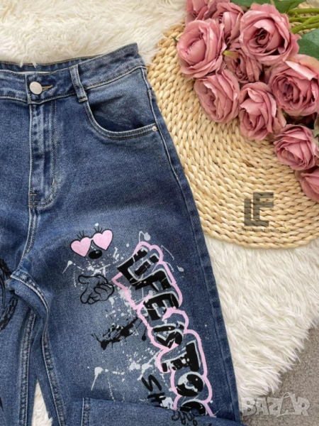 Кройка: Кройката е с прави, широки крачоли, издължаваща, средна към висока талия, ръчно рисувни