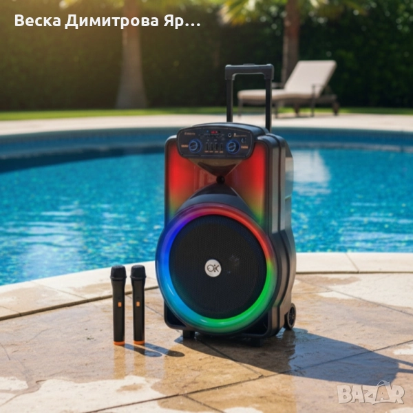 В комплекта: тонколона BT-1218, 2 безжични микрофона, дистанционно, зарядно;