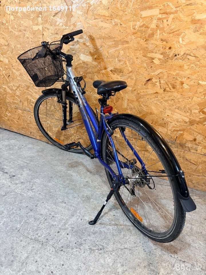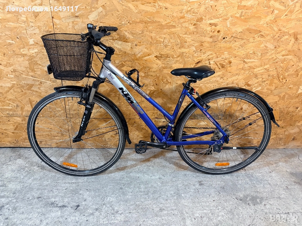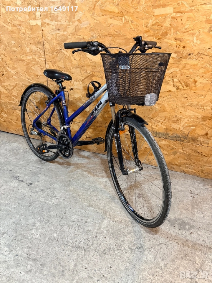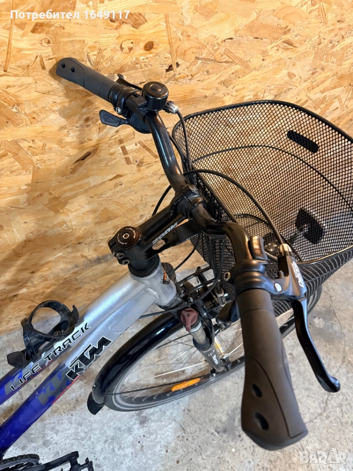 Продавам 28цола, малко употребяван, дамски градски велосипед KTM Life Track[made in Austria]. Олекотена, алуминиева рамка - 46см[Alloy 7005]. Външни скорости Shimano Deore - 27бр. c палцови команди Shimano Deore. Предна алуминиева-амортисьорна вилка RST със заключване. Алуминиеви курбели Shimano с алуминиеви педали. Спортна, ергономична седалка. Алуминиеви, двойностенни капли, и гуми Schwalbe с усилен градски профил. Предна и задна алуминиеви V-break спирачки Shimano Deore. Алуминиево кормило с алуминиева лапа Zoom. Кошница за багаж отпред. Олекотени пластмасови калници, стойка, светлоотразители, звънец. Кошничка за бутилка.