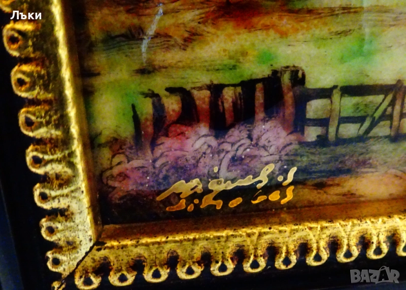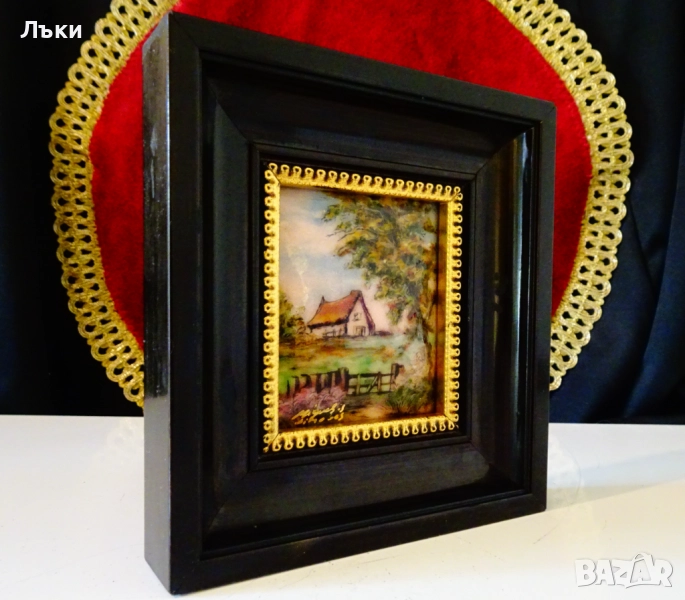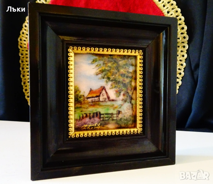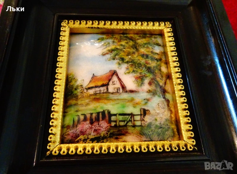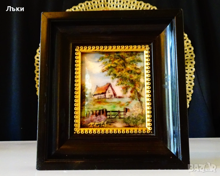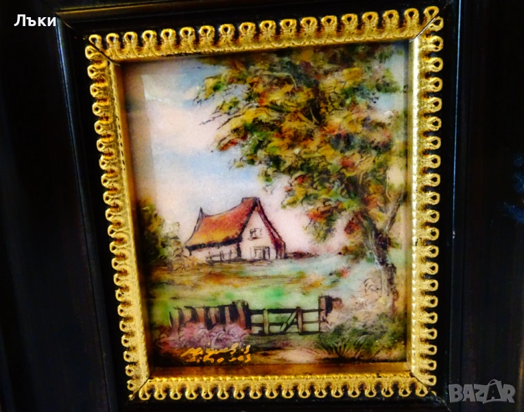 Стара картина,есенен пейзаж с кокетна къща,емайлирана