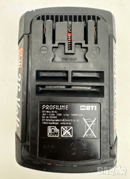 Продавам акумулаторна батерия на BTi 36V 2.0Ah със запазен външен вид, също така зарежда се до край и държи заряд отлично, внос от Франция. Батерията е съвместима с машини на Бош, Бернер и Бти работещи с 36V батерии. Пращаме с опция преглед и тест с куриерска фирма еконт може и лично предаване за гр. Шумен.