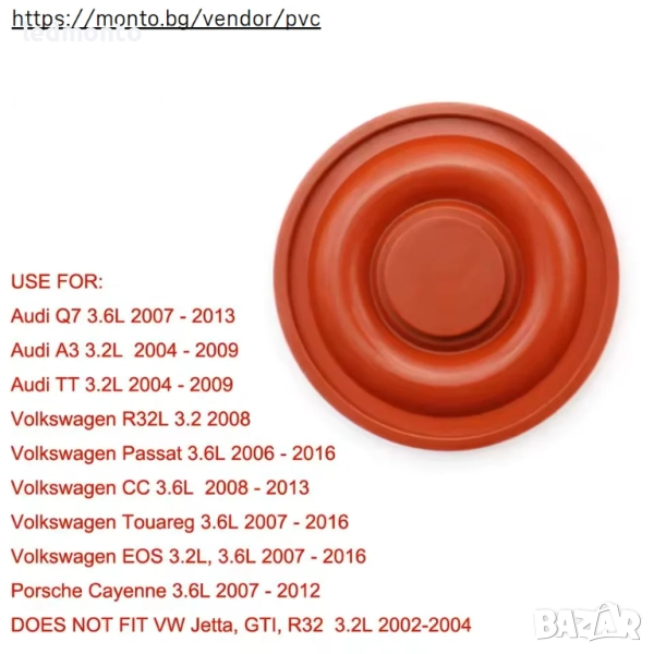 Този комплект съдържа две части – мембрана и уплътнителен пръстен, както е показано на снимките. Предназначен е за капак на клапан картерни газове (valve cover diaphragm seal) за VW Passat, CC, Touareg, EOS, Audi Q7, A3, TT, Porsche Cayenne 3.6L (2004–2016). Съвместим с OE номера: 03H103429H, 03H103429B, 03H103429C, 03H103429D, 022103429AA, 95810513530, 022103515A. Мембраната е 100% нова, изработена от висококачествена гума и пластмаса, осигуряваща надеждна херметичност и предотвратяваща течове на масло и картерни газове. Не е подходяща за VW Jetta, GTI, R32 3.2L (2002–2004).