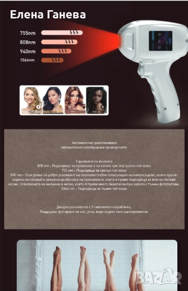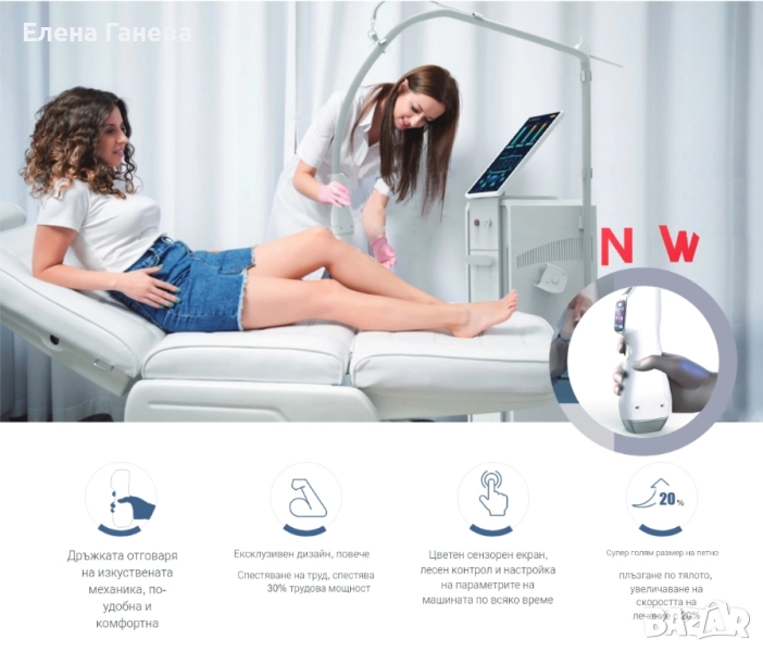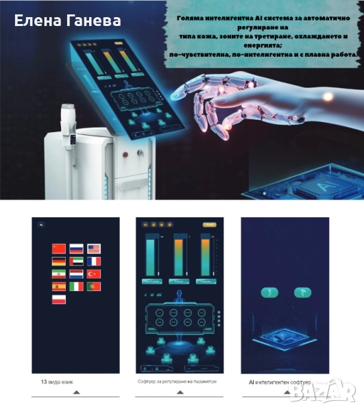 Infinity Clatro – професионален диоден лазер с USA Coherent модул и AI софтуер Infinity Clatro е високотехнологична система за лазерна епилация, създадена за професионална употреба. Апаратът комбинира четири дължини на вълната – 755nm, 808nm, 940nm и 1064nm, което осигурява ефективно третиране на всички типове кожа и косми. Благодарение на лазерния модул Coherent (САЩ) се гарантира стабилен енергиен изход, равномерно разпределение на импулса и дълъг експлоатационен живот – над 40 милиона изстрела. Вградената AI интелигентна система автоматично разпознава типа кожа, зоната и необходимата енергия, като оптимизира параметрите за максимална безопасност и резултатност. Охлаждането Peltier (Япония) достига температура до –32°C, което гарантира комфорт по време на работа и защита на кожата. Infinity Clatro разполага с 5 сменяеми накрайника за лице, тяло и чувствителни зони, както и с интуитивен сензорен интерфейс на 13 езика. Апаратът е подходящ за продължителна, непрекъсната работа и предлага висока производителност, ниска консумация и безкомпромисни резултати още след първата процедура. 💠 Infinity Clatro – професионалният избор за ефективна, безопасна и модерна лазерна епилация.