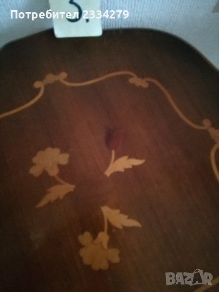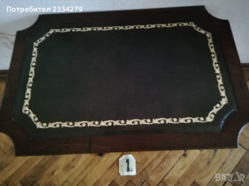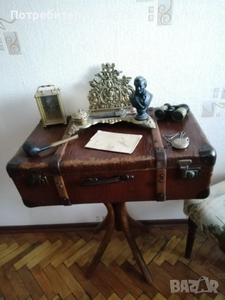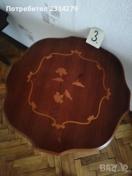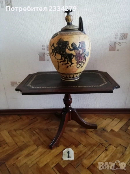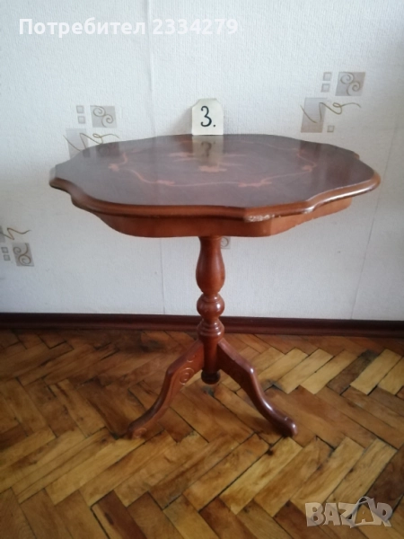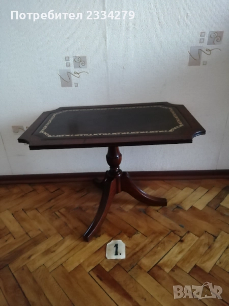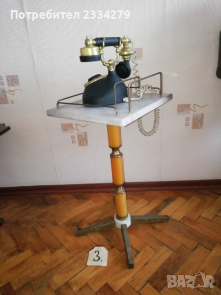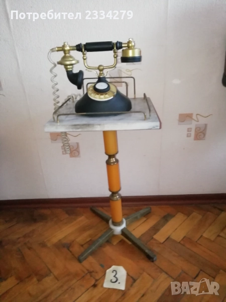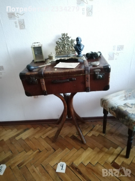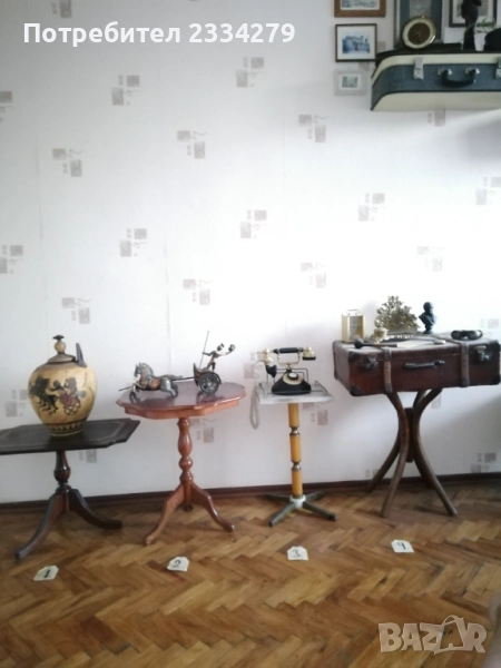 Стари помощни масички. N:1 масичка в стил барок, изработена от орнаментирано дърво и плота е от дърво и кожа, размери: височина 43см., дължина 60х40см., произход Германия, цена 37€.; N:2 (НЕВАЛИДНА); N:3 мраморна масичка за телефон, цветя статуи, изработена през 70-те години, размери: височина 55см., широчина 30х30см., цена 20€.; N:4 масичка авторска идея, изработена от куфар и стойка от