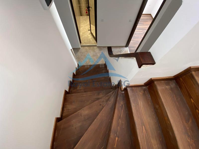 Разпределение: три етажа с двор и две тераси с панорамна гледка море, хол с предназначение за кухненски кът, две спални, гардеробна и две бани с две тоалетни.