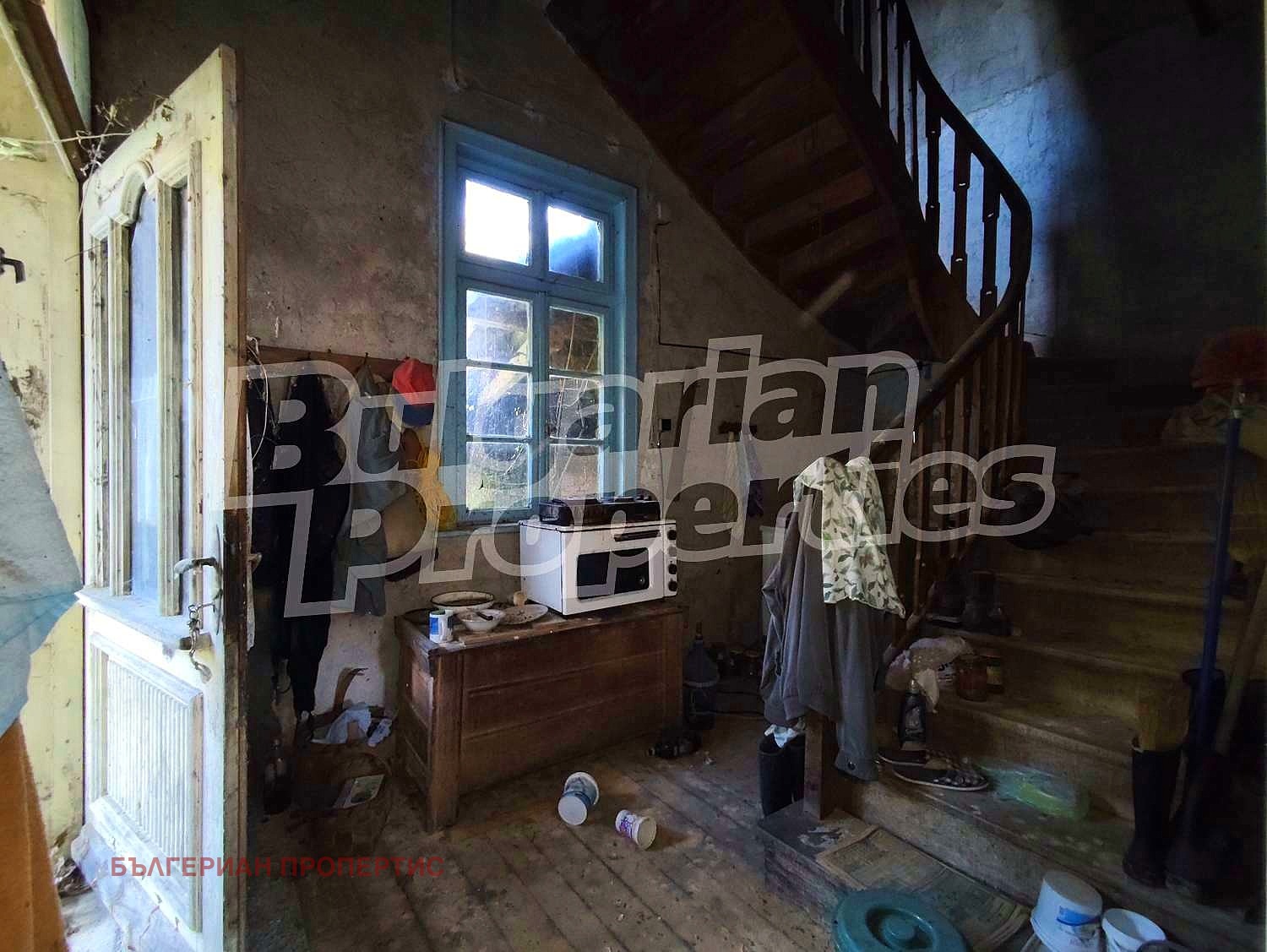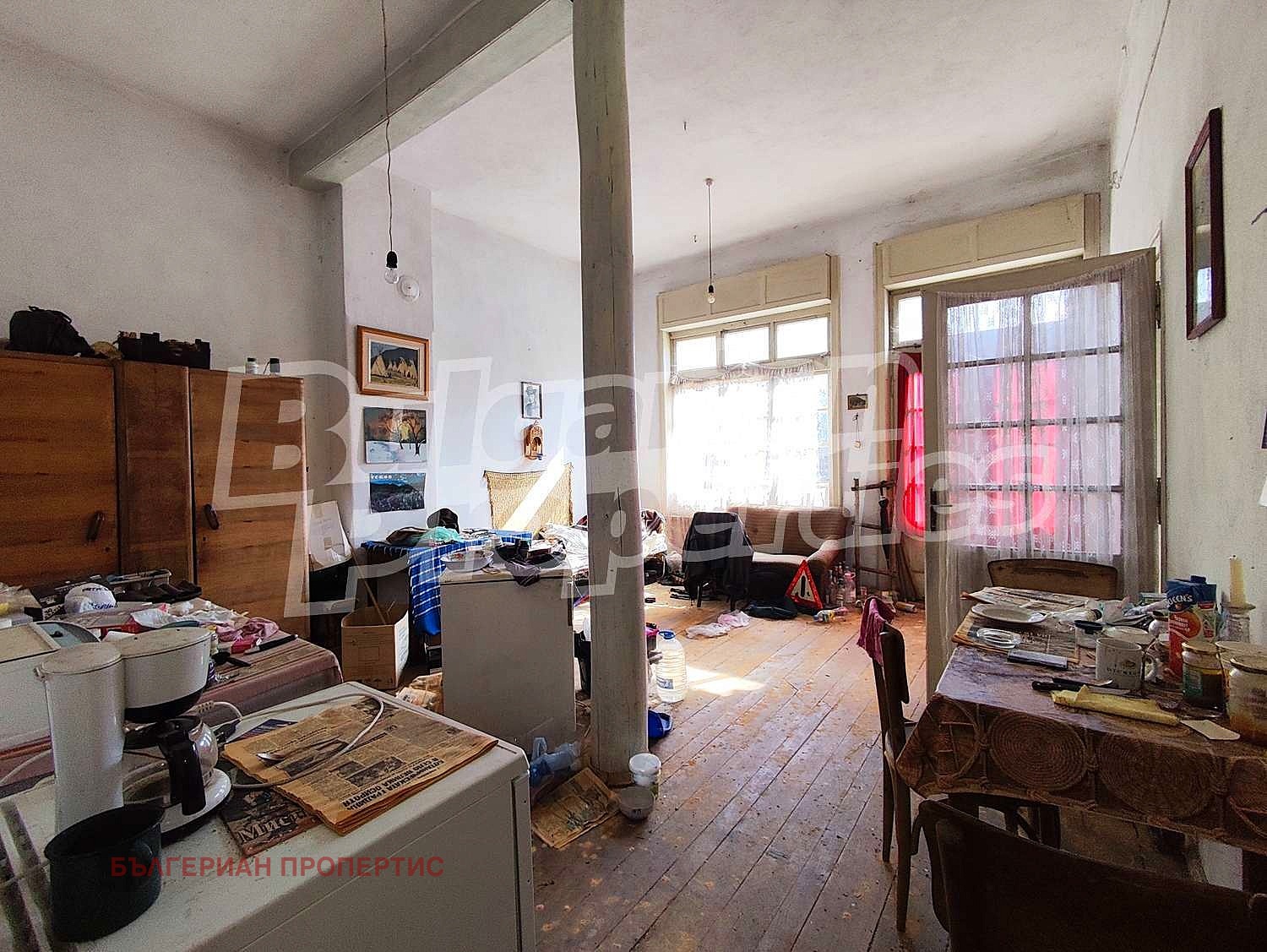 Първи етаж с височина на таваните около 3.20 м, включва голяма всекидневна, кухня, спомагателна стая и антре с вътрешно стълбище към второто ниво. Просторът и високите помещения дават възможност за интересни архитектурни решения при реновиране.