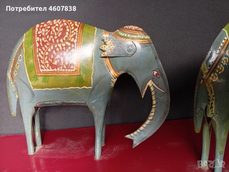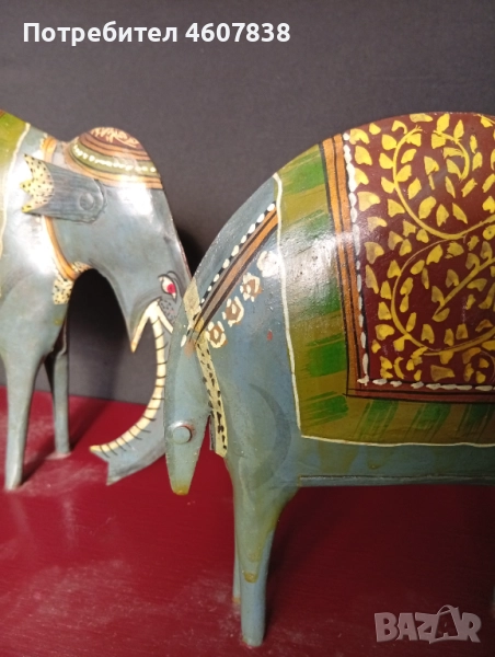 Стари метални слончета на дървена поставка ръчно рисувани.