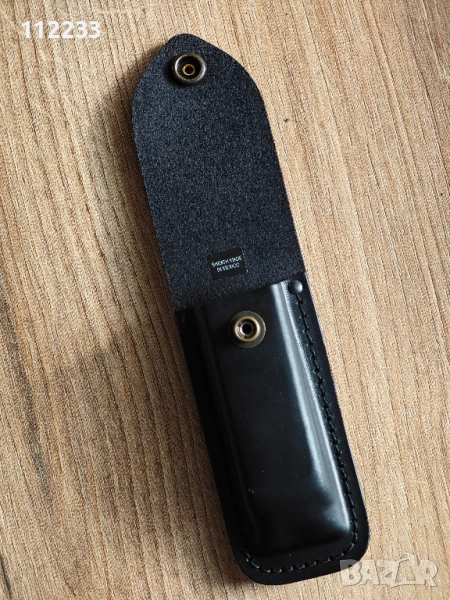 Ножът ми пристигна днес,но веднага му сложих пъпка за отваряне с една ръка и с нея не влиза в калъфа. Така че няма да го ползвам. Чисто нов е. Давам го заедно с кутията от ножа. Здрава,твърда естествена кожа. Made in Mexico. Предпочитам