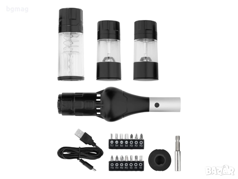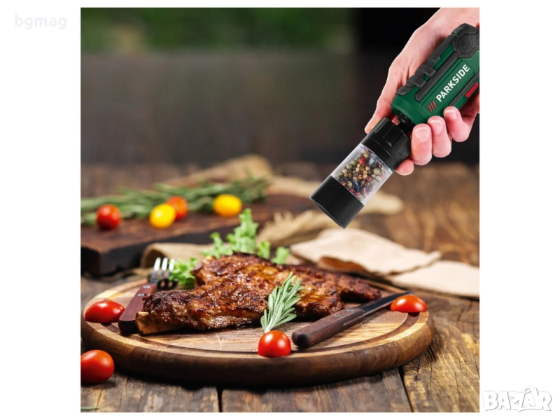 С комплект приставки, може да се използва като духалка за грил, тирбушон, мелничка за сол и черен пипер