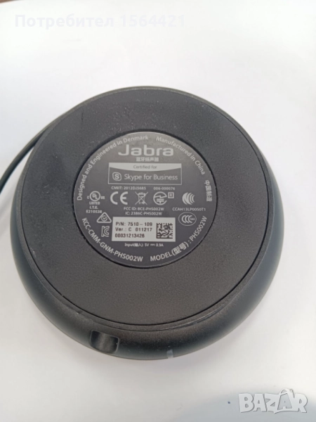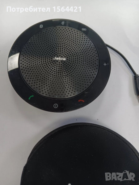 конферентен високоговорител Jabra Speak, спийкърфон, 7510-109, Jabra Speak 510 MS. Сертифициран от Microsoft портативен високоговорител с USB порт. Малко ползван, в отлично състояние. Подходящ за лаптоп, смартфон и таблет. Цвят - черен, работи с батерия: 1 бр. литиево-йонни батерия ( вкл.) Размери: диаметър 120 mm, височина: 33 mm, тегло 190 гр. Този високоговорител превръща всяка стая в конферентна зала: идеален за малки групи или индивидуални разговори - до 4 участника в конференцията. Изключително качество на звука и интуитивен потребителски интерфейс: 360-градусов микрофон, контрол на повикванията и лесни за използване бутони. Свържете високоговорителя към вашия компютър, мобилен телефон, таблет или слушалки, чрез USB или Bluetooth. Високоговорителят е отличен с награда Red Dot Design Award 2013, като номер 1 по качество на звука (глас и музика). Предлага се с мек калъф.