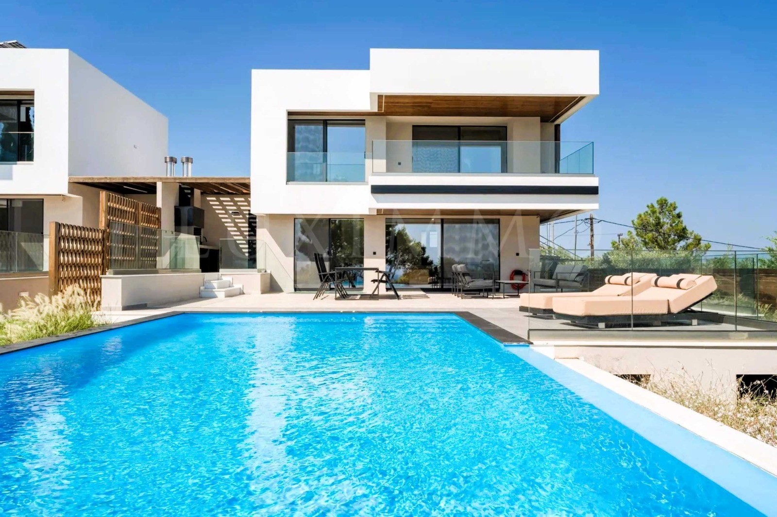 АКЦЕНТИ: Частен басейн с обширна зона за слънчеви бани, откъдето се разкрива спираща дъха гледка към сините води на Егейско море.