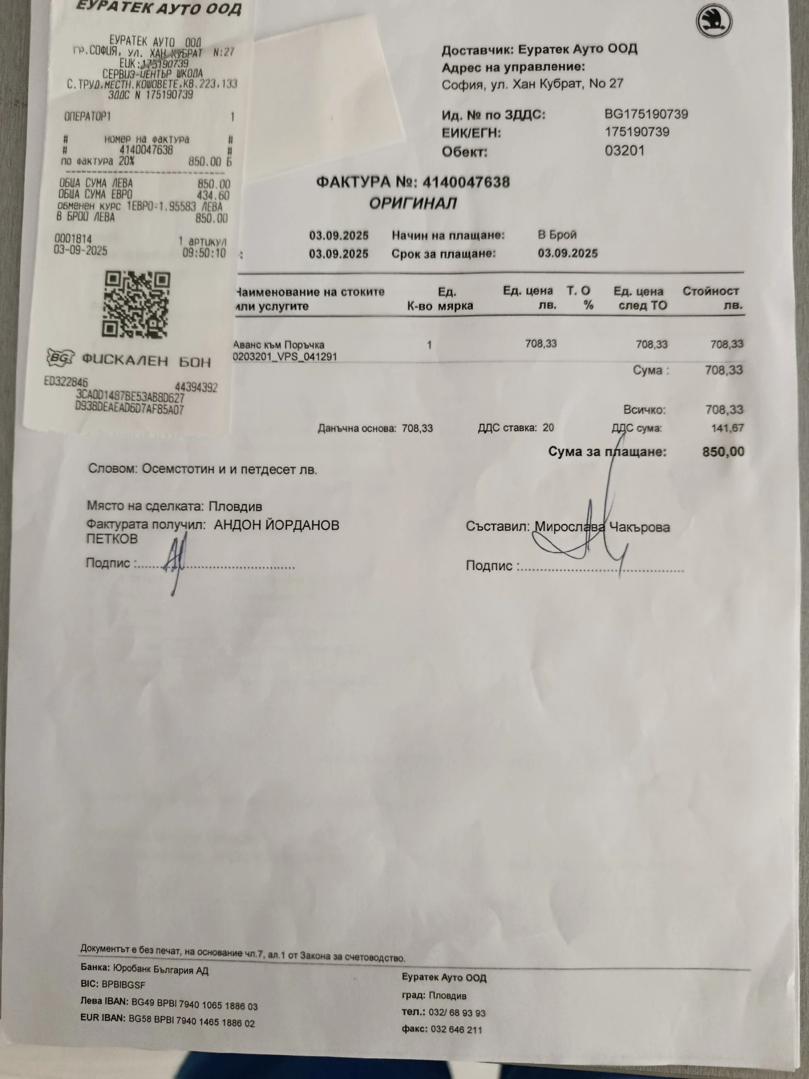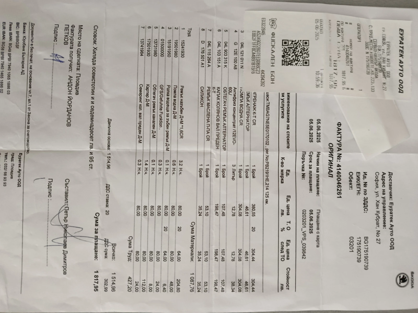 Гаранция от Еуротек- Шкода сервиз, на скоростна кутия - две години, сменени агренажен ремък, водна помпа, ремък маслена помпа гаранция - 150000 км. от сервиза. обслужвана само в сервиз Шкода. към автомобила има четири зимни гуми с лети джанти и комплект, предни и задни спирачни дискове с комплект накладки - АТЕ оригинал. личен, подържан автомобил.