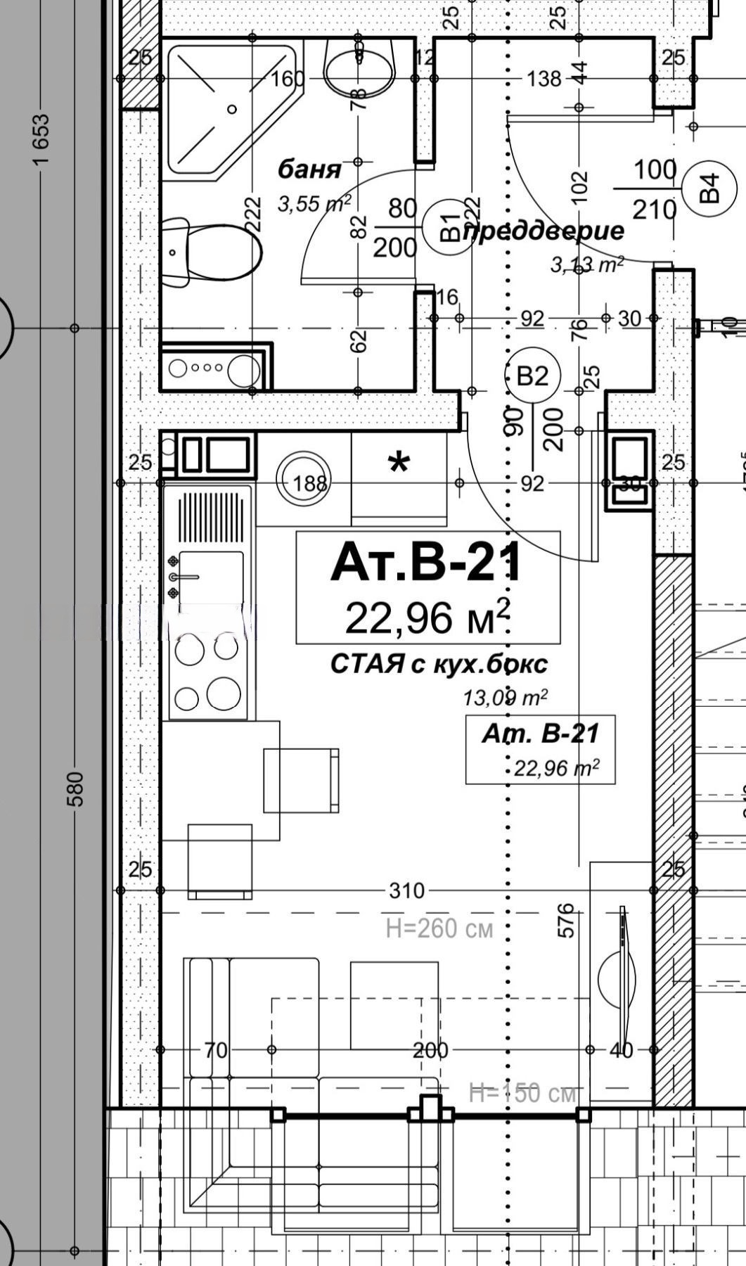 РАЗПРЕДЕЛЕНИЕ: Еднопространствено жилище със санитарен възел.