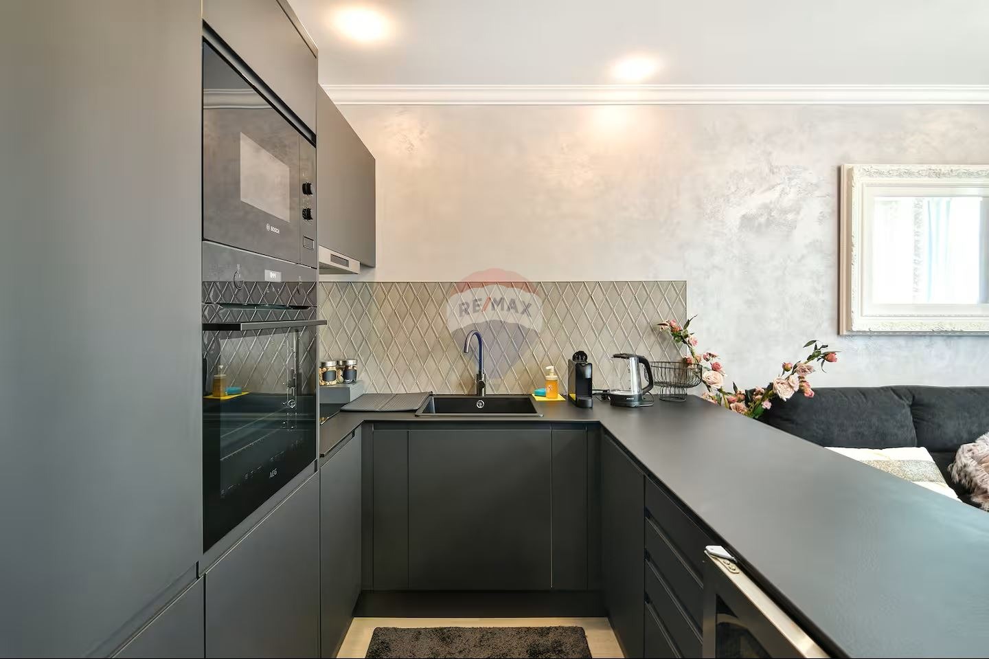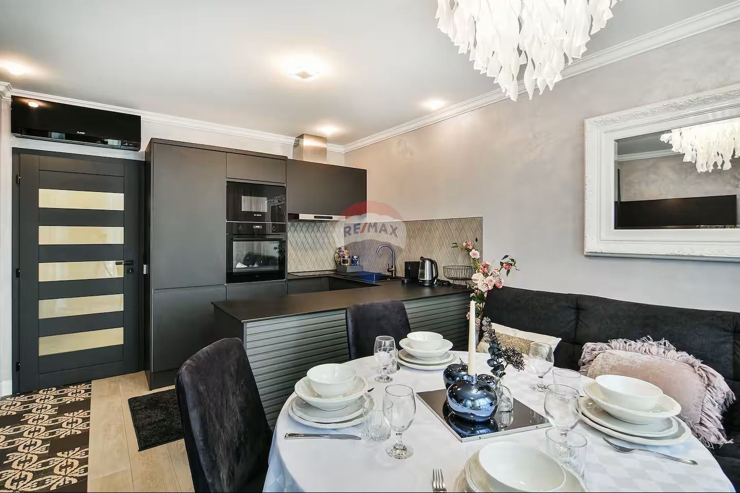 - Просторна всекидневна с кухненски бокс, оборудвана с вградени електроуреди, включително съдомиялна машина и хладилен шкаф за вино;