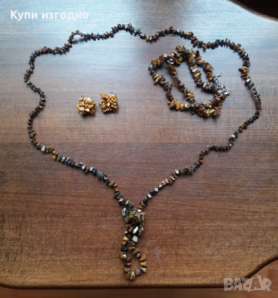 • Комплект от двуредо колие и обеци на клипс изработен от полускъпоценен камък тигрово око. Цена 25 лв.