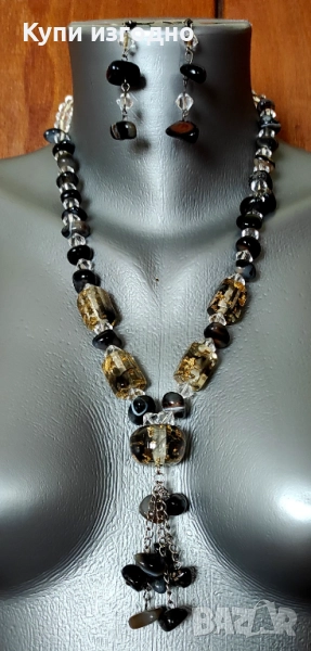 • Комплект от полиран оникс, чешки кристал и изкуствен кехлибар - колие и дълги обеци. Цена 20 лв.