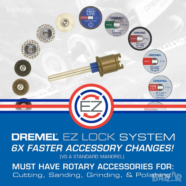 Dremel EZ - Lock System е първата патентована система от този вид. Дизайнът на дорник от една част опростява процеса на смяна на аксесоари и улеснява рязането на редица материали от метал до пластмаса