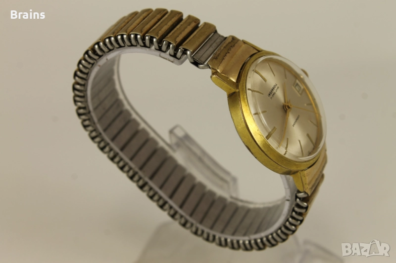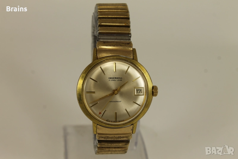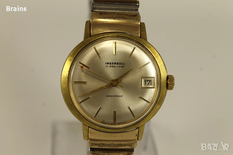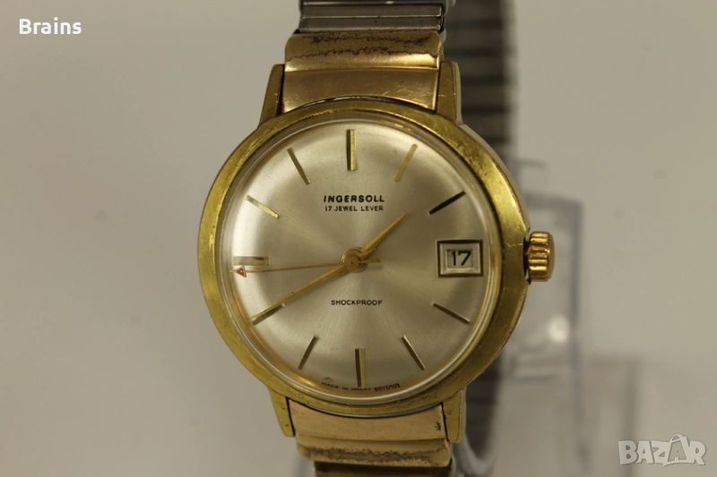 Мъжки ръчен часовник INGERSOLL от 1970-те години. Made in Great Britain. Позлатена каса и позлатена разтегателна верижка. Часовника работи точно, календара работи. Калибър 627 със 17 рубина. Циферблата и стрелките са в отлично състояние.