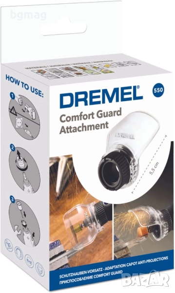 Dremel 550 Comfort Guard Attachment е комплект състоящ се от ротационна приставка за инструменти за повече удобство при рязане, шлайфане и почистване, предпазител срещу прах и малки частици, диск за рязане на метал, ротационна четка, диск за заточване