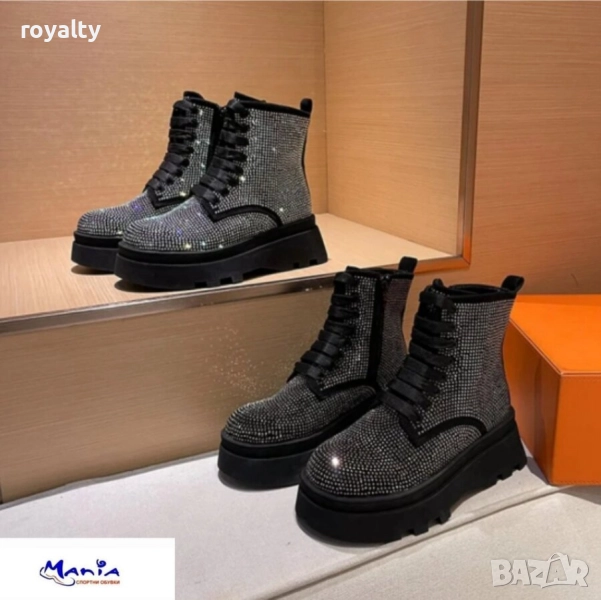 Дамски боти с блестящи камъчета.Горната част е еко велур покрит с блестящи камъчета,вътрешната е от текстил,ходилото е повдигнато и стабилно.Затварянето е с връзки и цип.