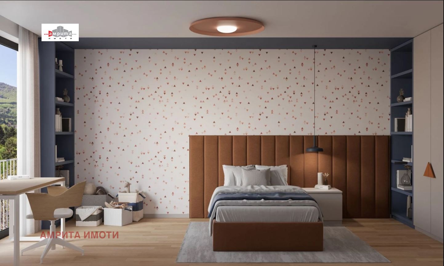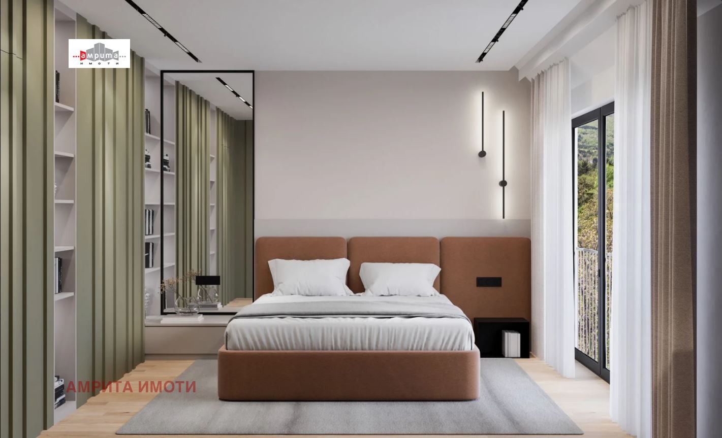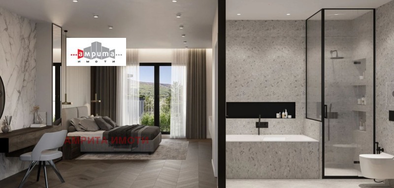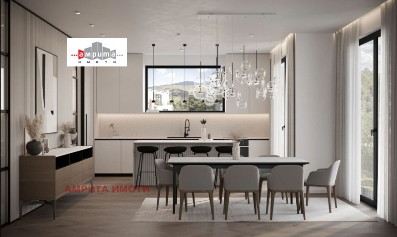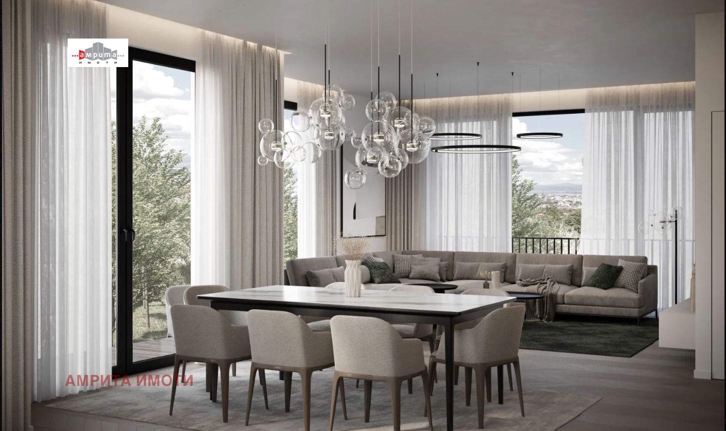 АМРИТА ИМОТИ има удоволствието да Ви представи стилна къща-близнак с РЗП от 368 кв.м и дворно място от 191 кв.м, част от бутиков затворен комплекс с 6 еднофамилни къщи, разположен върху терен от 2 137 кв.м. Комплексът е разположен в полите на Витоша, на тиха улица с бърз достъп до Околовръстен път, в близост до спирки на градски транспорт, училища, детски градини и супермаркети