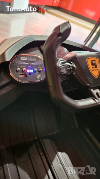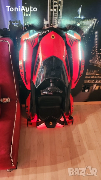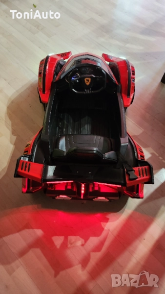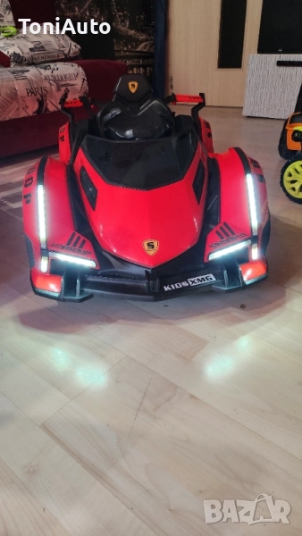 Ламборгинито на практика е ново. Изкарвано е два пъти за малко пред блока! количката е с два електромотора на задно предаване и нов марков по-мощен акумулатор! Върви както на 6 така и на 12 волта като на 12 волта става много бързо. Има дистанционно което никога не е ползвано! Количката е модел който в България още го няма и е направена по последният протоип на Lamborghini Vision GT . Последните три снимки са на оригиналното Ламбо!