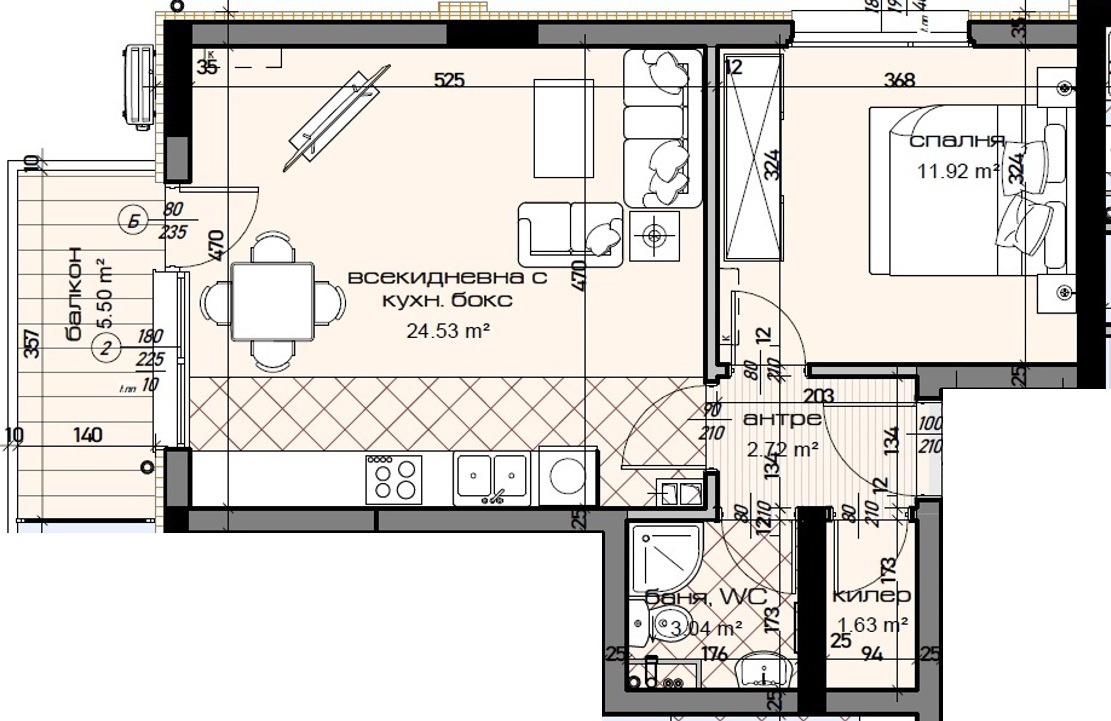 Имотът Представлява : Входно антре, Дневна с кухненска част и място за мека мебел с излаз на тераса, уютна спалня , килер и баня с тоалетна в едно. Жилището се намира в новострояща се жилищна сграда с отлична локация!