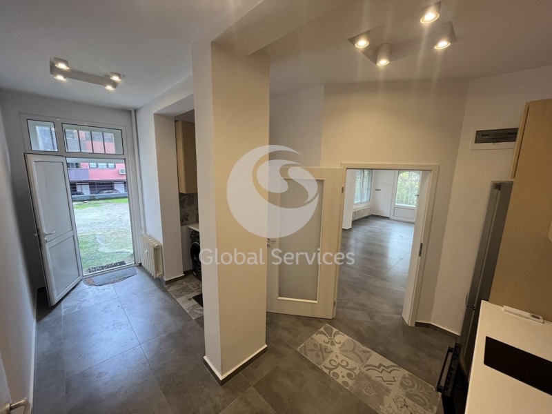 Предлагаме напълно ремонтирано партерно помещение в квартал Изгрев, подходящо както за жиеене, за офис, така и за търговска цел. С перфектно местоположение, в близост до Борисова градина и спирки на градски транспорт. Помещението разполага с кухненски бокс, напълно оборудван с нови уреди: печка, миялня, сушилня и хладилник. Допълнително предимство е наличието на два входа към помещението.