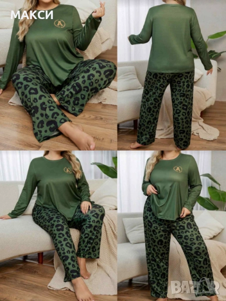 Макси силно еластичен и мек домашен комплект /пижама/ - блуза + долнище с ластична висока талия и широки крачоли в модерен леопардов десен /кафяво и маслено зелено/