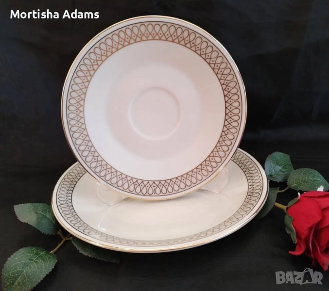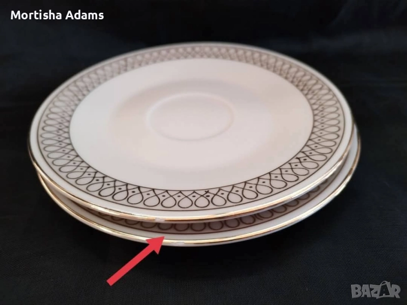 Латиерата и двете подложни чинийки са с дребни несъвършенства на златните кантове. Драскотинки по чиниите, видими под ъгъл.