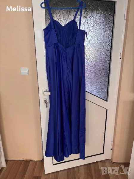 Роклята съм я обличала само веднъж – за рождения ми ден. Тя е като нова. Има цепка на крака. Размерът е регулируем от S до M – отзад на гърба с връзки. Роклята е тъмносиня