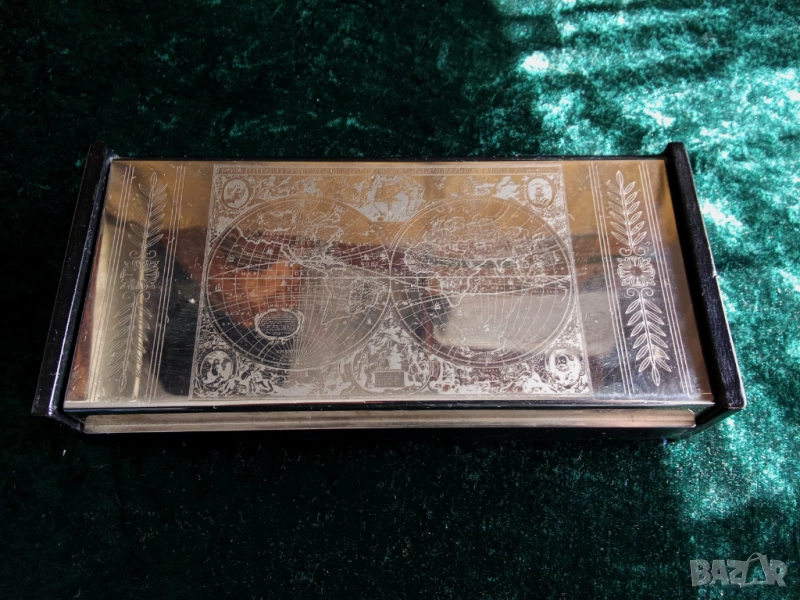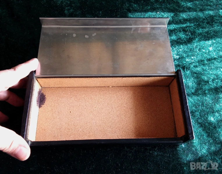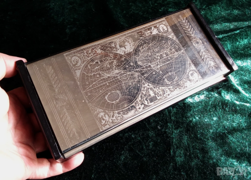 КУТИЯ * ПРАЗЕН ДЖОБ * КОЖА * СТОМАНА * ГРАВИРАНЕ * КАРТА НА СВЕТА * СОЛИНГЕН * НОВА немско производство СОЛИНГЕН - 1980 - МНОГО СЪВРЕМЕННА ОТ МАТИРАНА СТОМАНА И ЧЕРНА КОЖА 23,5 см x 10,5 см x 5 см великолепна и отлична изработка - Капакът е изработен от стомана, декориран с гравюра "карта на света" Вътрешността е облицована с корк Превъзходен елегантен празен джоб, който може да се използва и на бюро или в хола за пури или цигари; или за елегантно съхранение на карти или други неща НЕМСКО производство