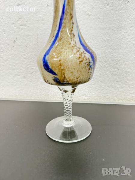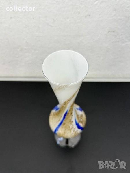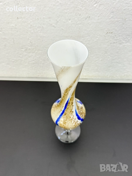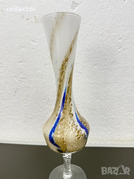 Вазата е с издължена, извита форма, разширяваща се към отвора и към основата, която е поставена върху прозрачно, усукано стъбло. Изработена е от опалово стъкло в бял цвят, с вплетени шарки в кафяво-златисти нюанси и отличителна вертикална синя ивица.